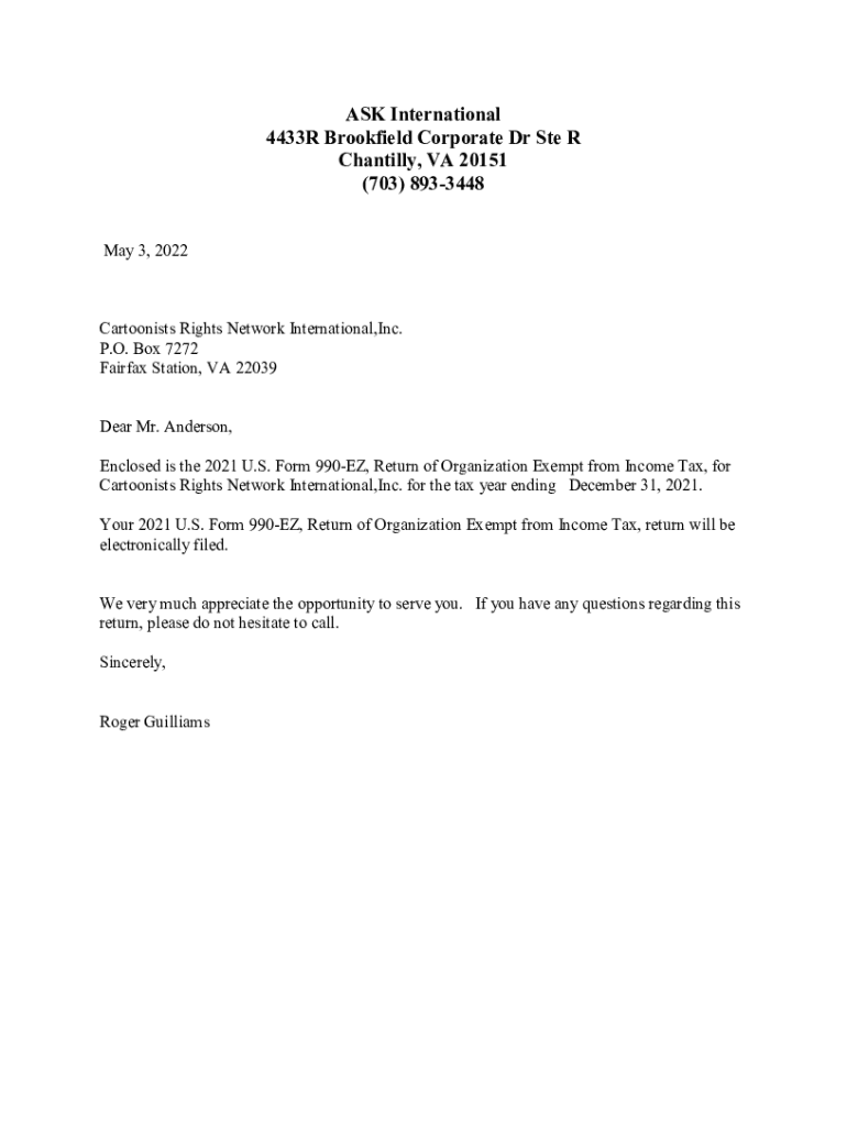 ASK International 4433R Brookfield Corporate Dr Ste R Chantilly, VA 20151 (703) 8933448 May 3, 2022Cartoonists Rights Network International, Inc. P.O. Box 7272 Fairfax Station, VA 22039 Dear Mr. Anderson,