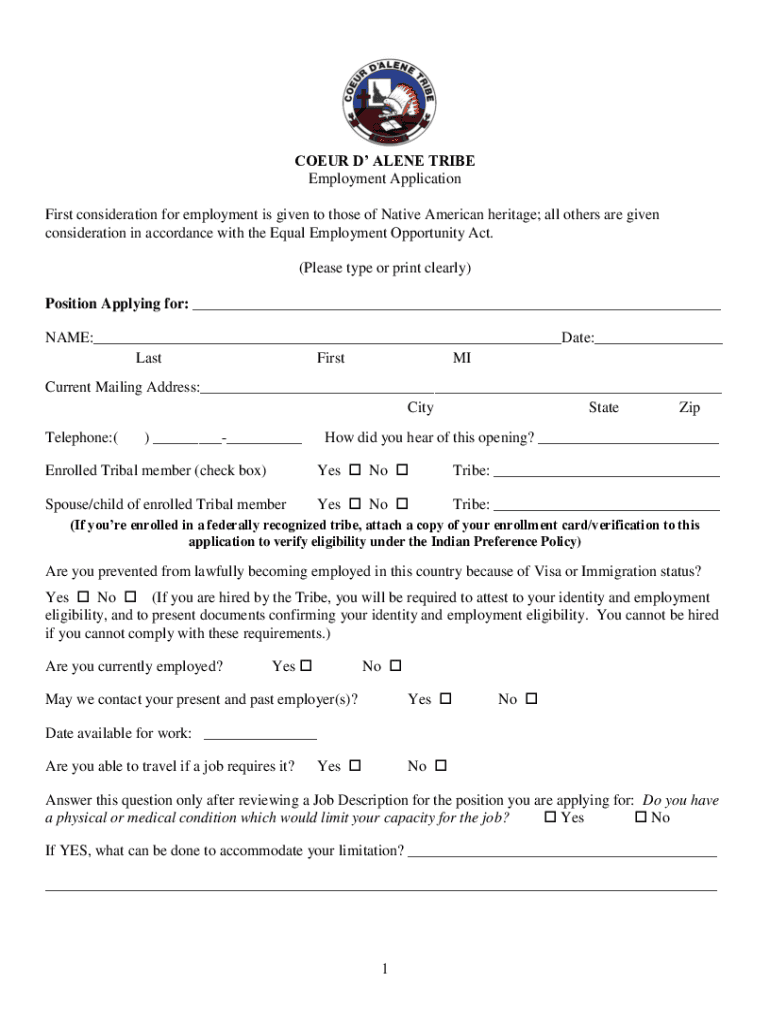 COEUR D ALONE TRIBE Employment Application First consideration for employment is given to those of Native American heritage; all others are given consideration in accordance with the Equal Employment