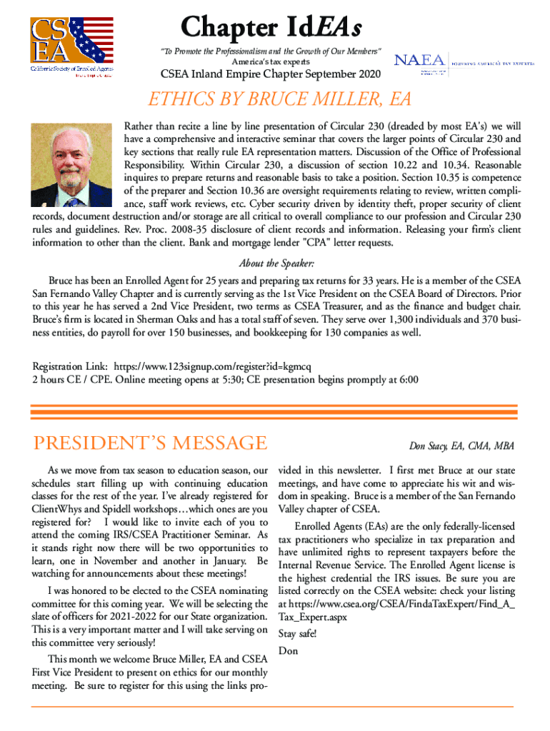 To Promote the Professionalism and the Growth of Our Members Americas tax expertise Inland Empire Chapter September 2020ETHICS BY BRUCE MILLER, EA Rather than recite a line by line presentation of