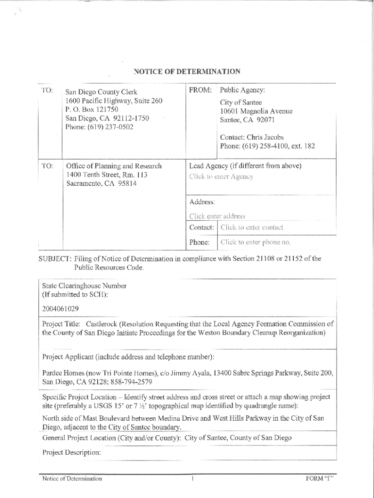 Get the free NOTICE OF DETERMINATION TO: San Diego County Clerk 1600 ...