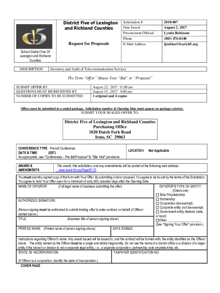 District Five of Lexington and Richland CountiesRequest for ProposalsSolicitation # Date Issued2018007 August 2, 2017Procurement Official Lynda RobinsonPhone(803) 4768140EMail Addressljrobins@lexrich5.orgSchool