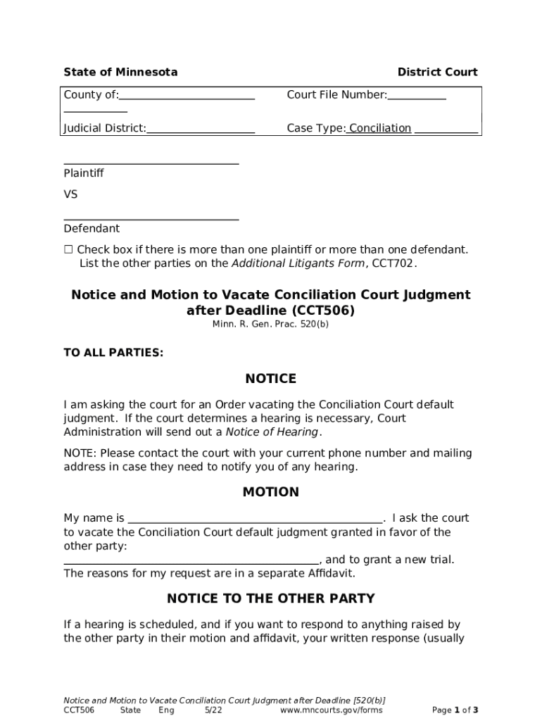 Notice and Motion to Vacate Conciliation Court Judgment after Deadline 520(b) template instructions