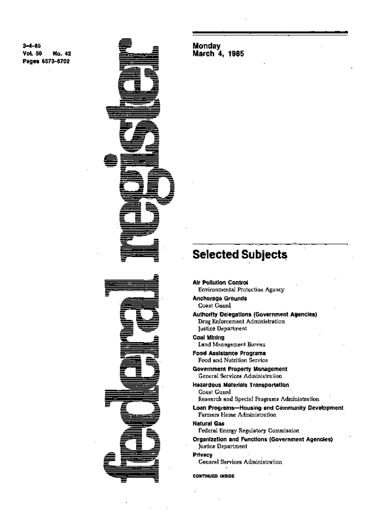 3485 Vol. 50 No. 42 Pages 85738702Monday March 4, 1985Selected Subjects Air Pollution Control Environmental Protection Agency Anchorage Grounds Coast Guard Authority Delegations (Government Agencies)
