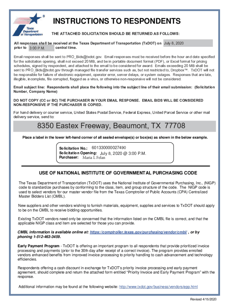 7+($$77&+(\'62/, &$,77,216+28/\'%(5(7851(\'$6)2//2:$6OOUHVSRQVHVVKDOOEHUHFHLYHGDWWKH7H[DV\'HSDUWPHQWRI7UDQVSRUWDWLRQ7[\'27RQ July 8, 2020,