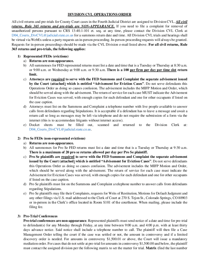 DIVISION CVL OPERATIONS ORDER All civil returns and pretrials for County Court cases in the Fourth Judicial District are assigned to Division CVL. All civil returns, Rule 365 returns and pretrials