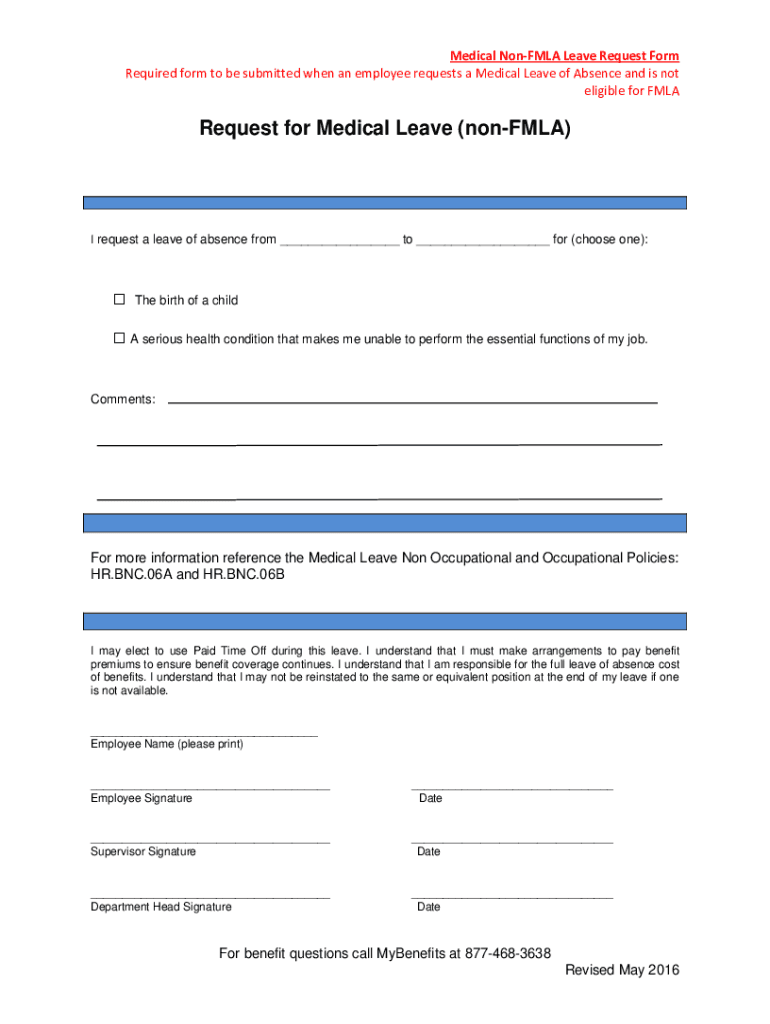 Obtain the necessary paperwork for non-family medical leave from your Human Resources department.