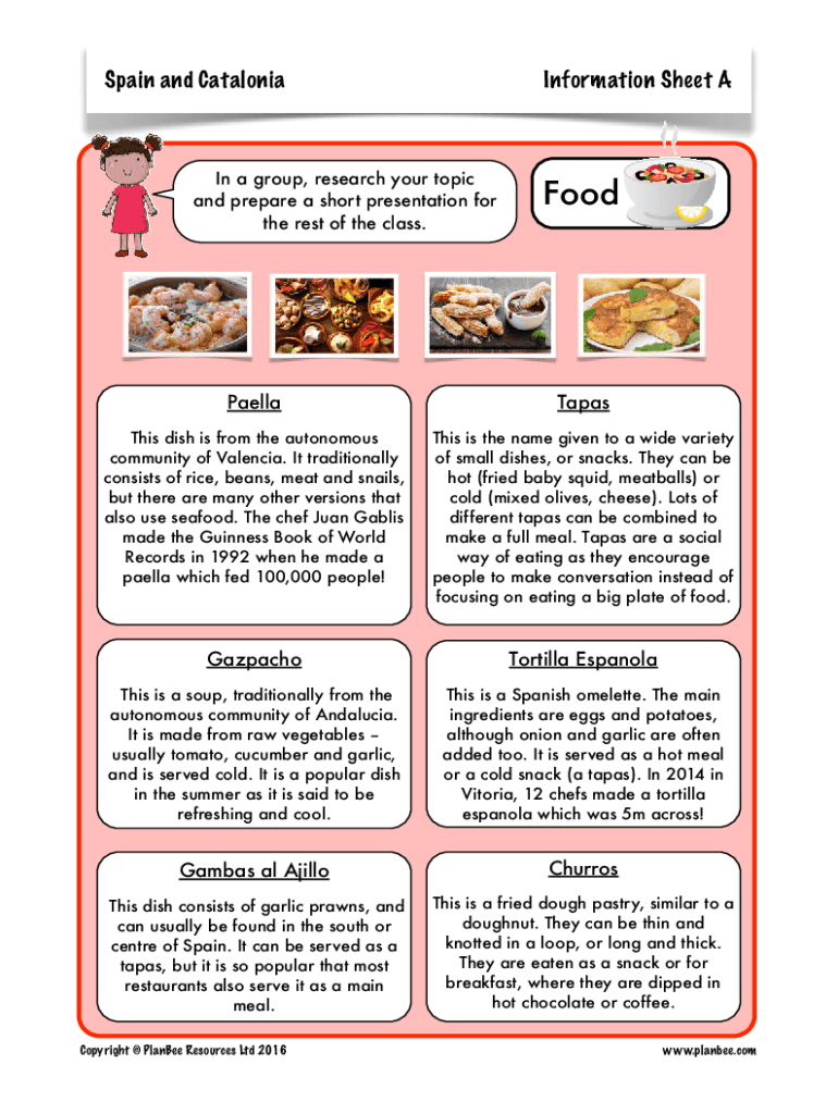 Spain and CataloniaInformation Sheet Ain a group, research your topic and prepare a short presentation for the rest of the class. FoodPaellaTapasThis dish is from the autonomous community of Valencia.
