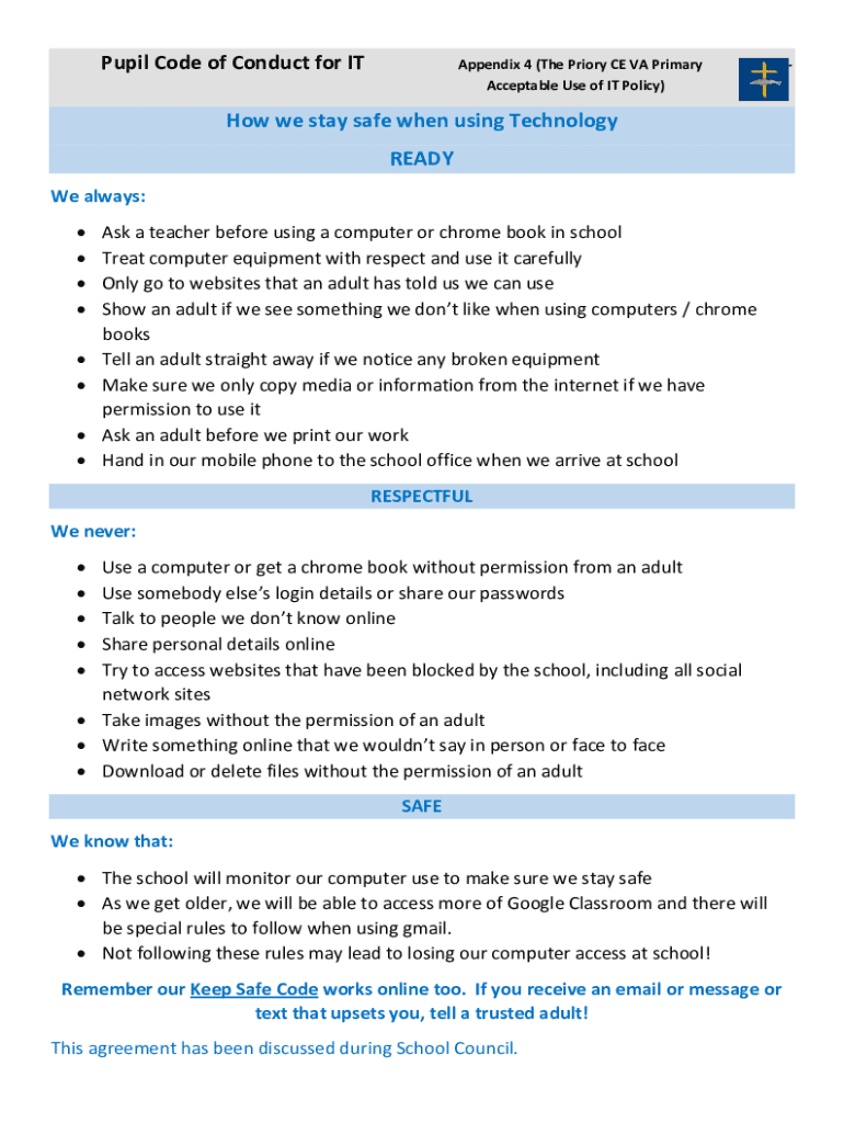 Pupil Code of Conduct for Appendix 4 (The Priory CE VA Primary Acceptable Use of IT Policy)School How we stay safe when using Technology READY We always: Ask a teacher before using a computer or Chromebook