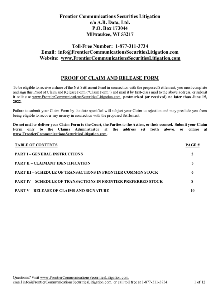 Frontier Communications Securities Litigation c/o A.B. Data, Ltd. P.O. Box 173044 Milwaukee, WI 53217 Toll-free Number: 18773113734 Email: info@FrontierCommunicationsSecuritiesLitigation.com Website:
