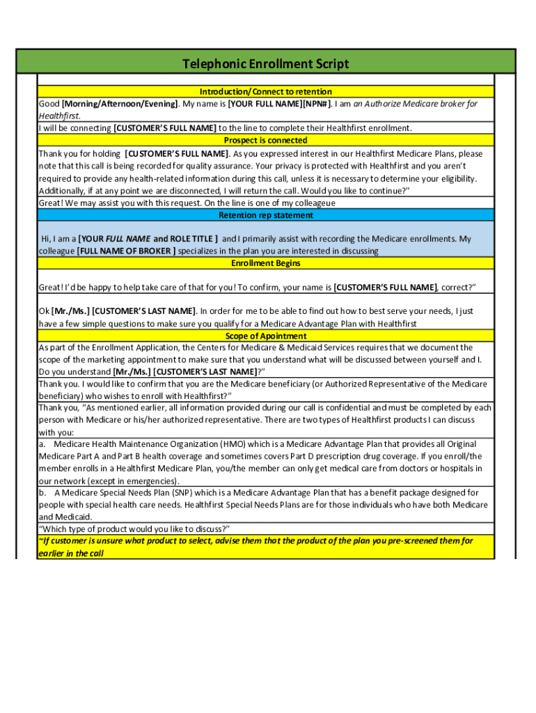 Telephonic Enrollment Script Introduction/Connect to retention Good [Morning/Afternoon/Evening]. My name is [YOUR FULL NAME][NPN#]. I am an Authorize Medicare broker for Health first. I will be connecting