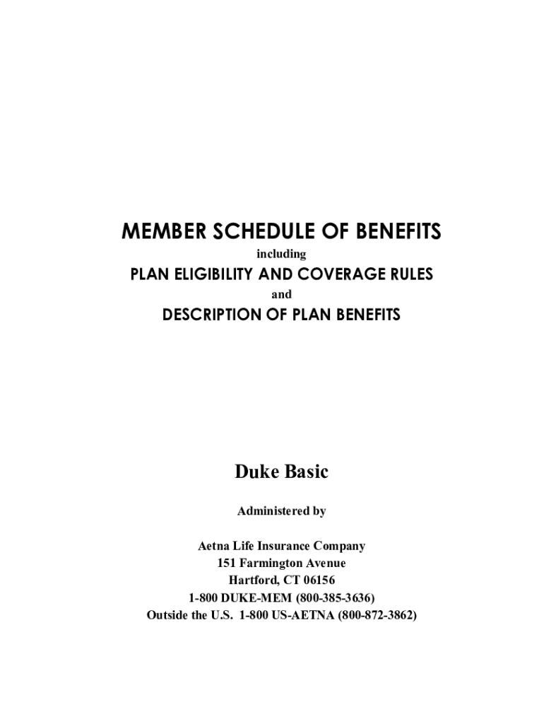 MEMBER SCHEDULE OF BENEFITS includingPLAN ELIGIBILITY AND COVERAGE RULES description OF PLAN BENEFITS Duke Basic Administered by Aetna Life Insurance Company 151 Farmington Avenue Hartford, CT 06156