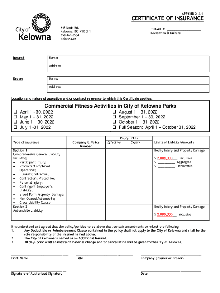 Get the free APPENDIX A-1 CERTIFICATE OF INSURANCE - Kelowna