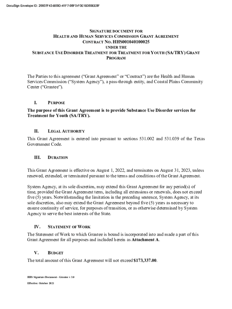 SIGNATURE DOCUMENT FOR HEALTH AND HUMAN SERVICES COMMISSION GRANT AGREEMENT CONTRACT NO. HHS001040100025 UNDER SUBSTANCE USE DISORDER TREATMENT FOR YOUTH (SA/TRY) GRANT Program Parties to this agreement