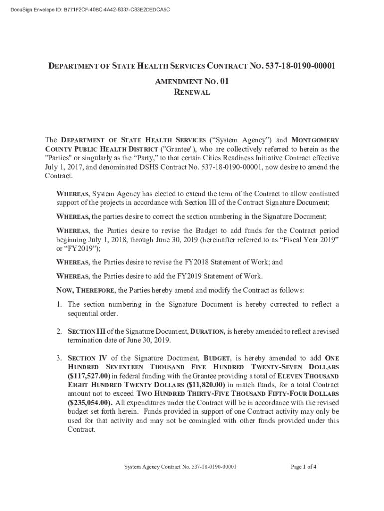 DocuSign Envelope ID: B771F2CF40BC4A428337C83E2DEDCA5CDEPARTMENT OF STATE HEALTH SERVICES CONTRACT NO. 53718019000001 AMENDMENT NO. 01 Renewable DEPARTMENT OF STATE HEALTH SERVICES (System Agency)