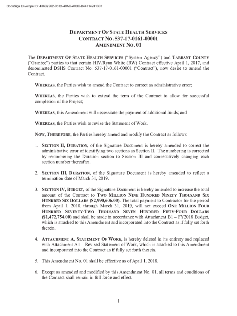 DocuSign Envelope ID: 436C7262051D40ACA0BCB44714241307DEPARTMENT OF STATE HEALTH SERVICES CONTRACT NO. 53717016100001 AMENDMENT NO. 01 The DEPARTMENT OF STATE HEALTH SERVICES (System Agency) and TARRANT
