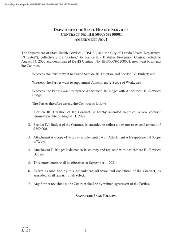 DEPARTMENT OF STATE HEALTH SERVICES CONTRACT NO. HHS000865200001 AMENDMENT NO. 1 The Department of State Health Services (DSS) and the City of Laredo Health Department (\” Grantee\”), collectively