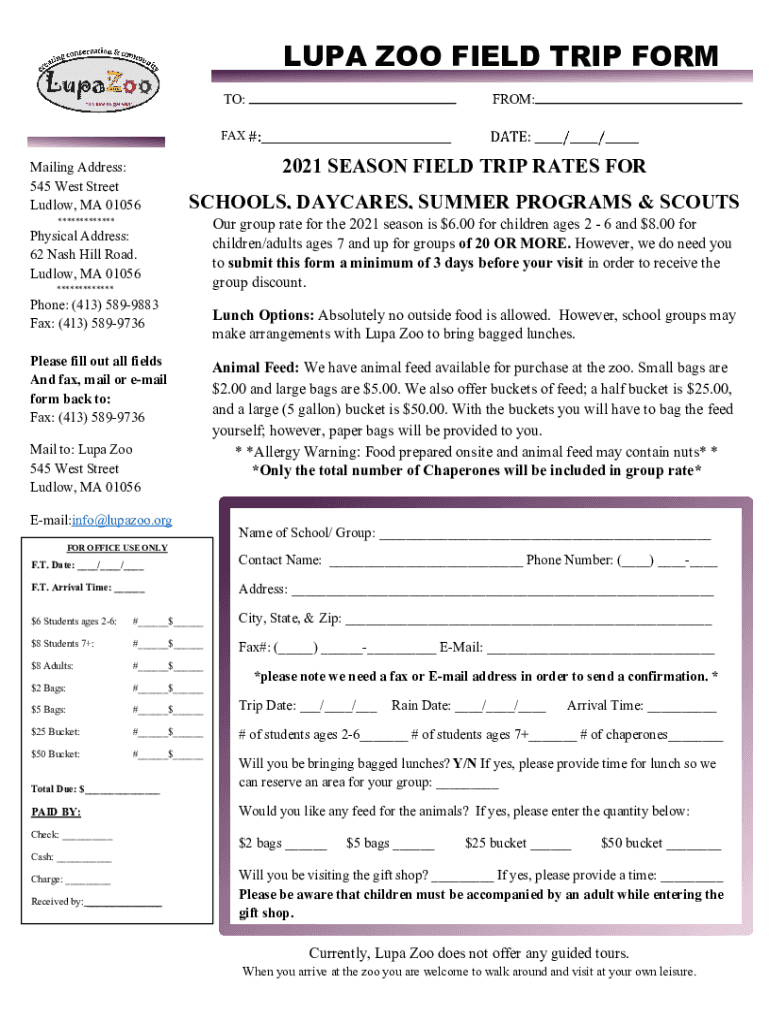 LUNA ZOO FIELD TRIP FORM TO:FROM:Failing Address: 545 West Street Ludo, MA 01056 *************2021 SEASON FIELD TRIP RATES FOR SCHOOLS, DAYCARES, SUMMER PROGRAMS & SCOUTSPhysical Address: 62 Nash