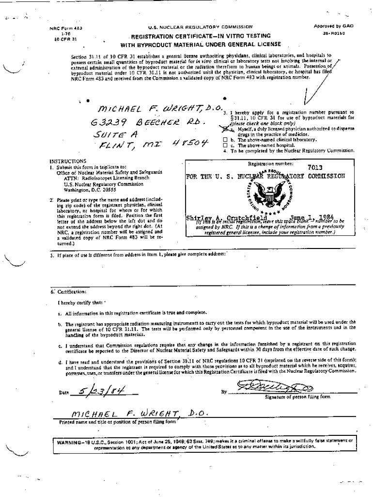 C.NRC Form 483 1.76 10 CFR 31U. S. NUCLEAR REGULATORY COMMISSIONApproved by REGISTRATION CERTIFICATE IN VITO TESTING WITH BYPRODUCT MATERIAL UNDER GENERAL LICENSE38 R0160Section 31.11 of 10 CFR 31