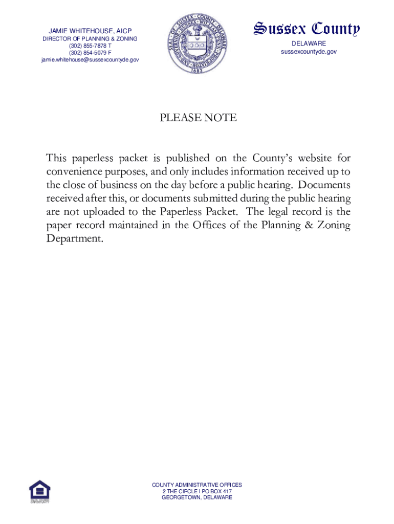 Sussex CountyJAMIE WHITEHORSE, ICP DIRECTOR OF PLANNING & ZONING (302) 8557878 T (302) 8545079 F jamie.whitehouse@sussexcountyde.govDELAWARE sussexcountyde. Please NOTE This paperless packet is published