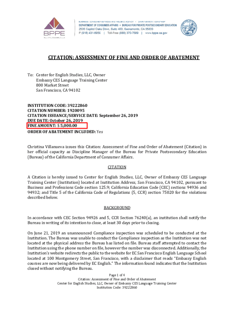 CITATION: ASSESSMENT OF FINE AND ORDER OF ABATEMENT To: Center for English Studies, LLC, Owner Embassy CES Language Training Center 800 Market Street San Francisco, CA 94102INSTITUTION CODE: 39222860