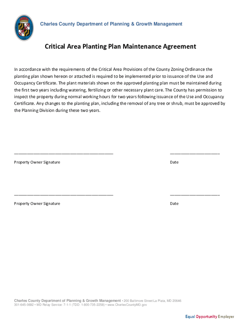 Charles County Department of Planning & Growth ManagementCritical Area Planting Plan Maintenance Agreement In accordance with the requirements of the Critical Area Provisions of the County Zoning