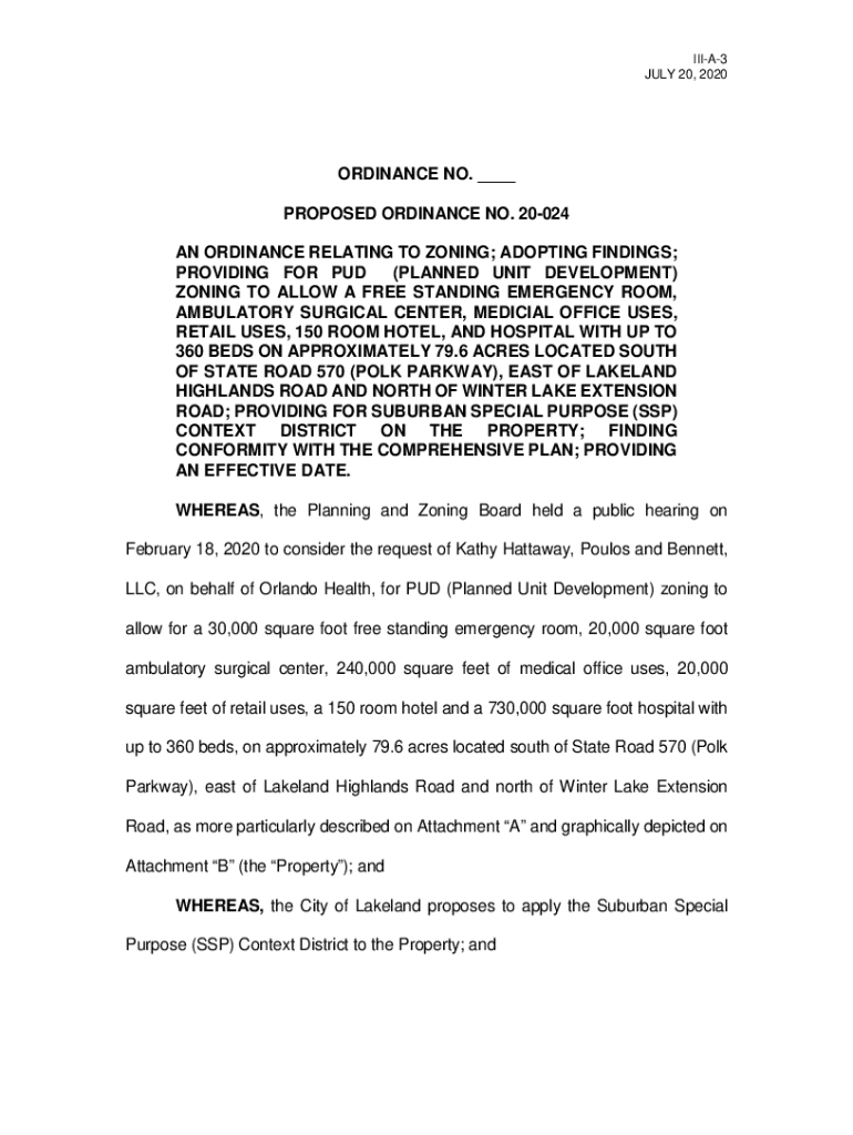 IIIA3 JULY 20, 2020ORDINANCE NO. ___ PROPOSED ORDINANCE NO. 20024 AN ORDINANCE RELATING TO ZONING; ADOPTING FINDINGS; PROVIDING FOR PUD (PLANNED UNIT DEVELOPMENT) ZONING TO ALLOW A FREE STANDING EMERGENCY