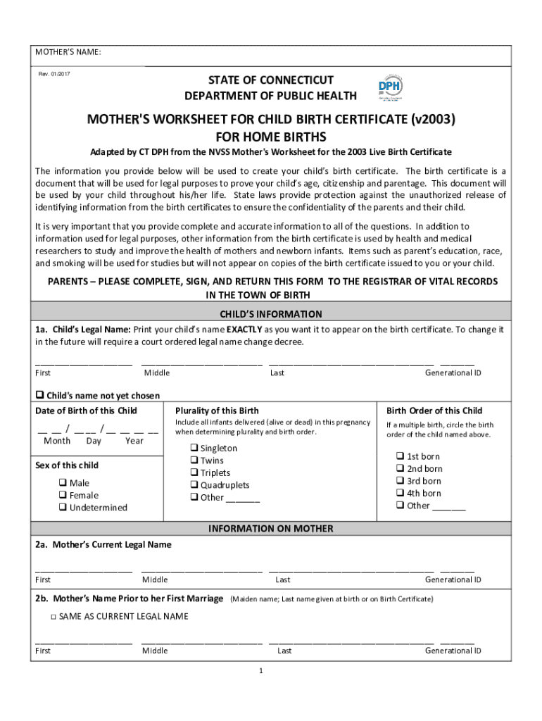 MOTHERS NAME: Rev. 01/2017STATE OF CONNECTICUT DEPARTMENT OF PUBLIC HEALTHMOTHER\'S WORKSHEET FOR CHILD BIRTH CERTIFICATE (v2003) FOR HOME BIRTHS Adapted by CT DPH from the NSS Mother\'s Worksheet