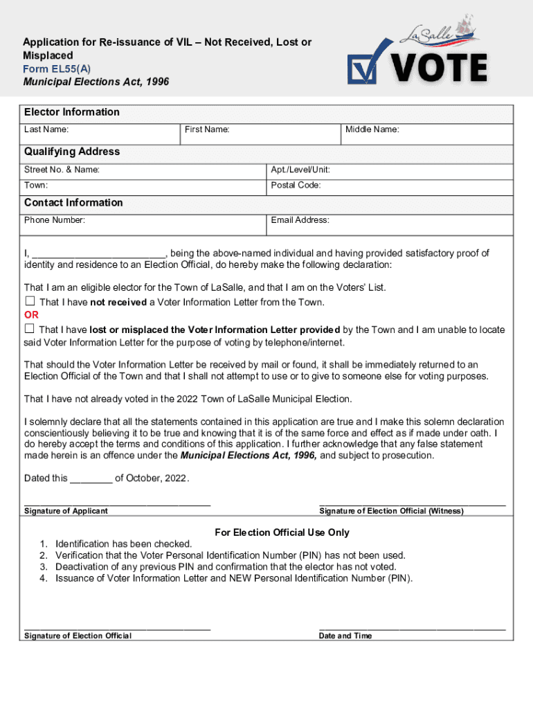 Application for Re issuance of OIL Not Received, Lost or Misplaced Form EL55(A) Municipal Elections Act, 1996 Elector Information Last Name:First Name:Middle Name:Qualifying Address Street No. & Name:Apt./Level/Unit:Town:Postal