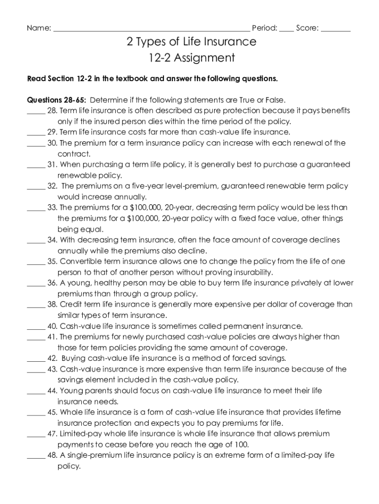 Get the free Name: Period: Score: 2 Types of Life Insurance 12-2 Assignment