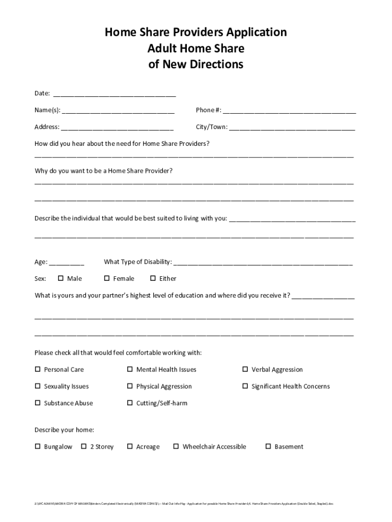 Home Share Providers Application Adult Home Share of New Directions Date: ___ Name(s): ___Phone #: ___Address: ___City/Town: ___How did you hear about the need for Home Share Providers? ___ Why do
