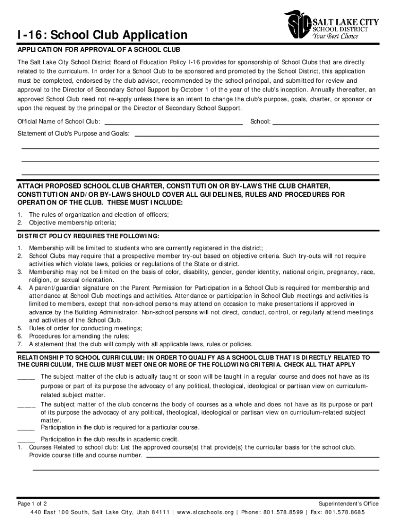 I16: School Club Application FOR APPROVAL OF A SCHOOL CLUB The Salt Lake City School District Board of Education Policy I16 provides for sponsorship of School Clubs that are directly related to the