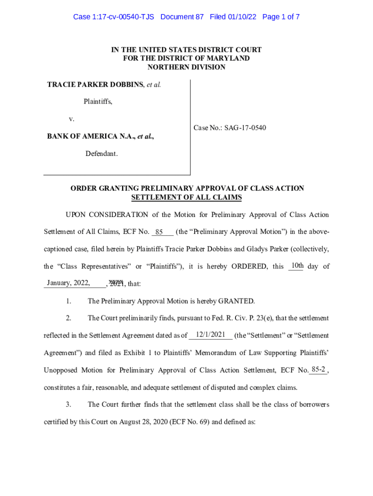 Case 1:17cv00540TJS Document 87 Filed 01/10/22-Page 1 of 7IN THE UNITED STATES DISTRICT COURT FOR THE DISTRICT OF MARYLAND NORTHERN DIVISION TRACIE PARKER DOBBINS, et al. Plaintiffs, v. BANK OF AMERICA