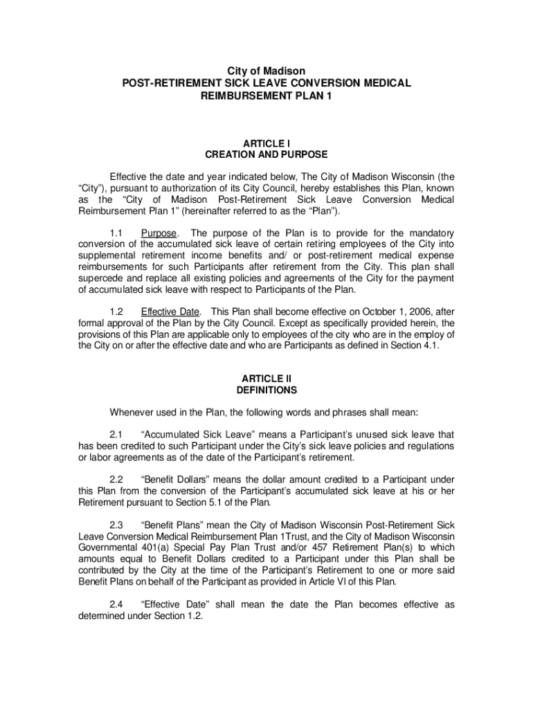 City of Madison POSTRETIREMENT SICK LEAVE CONVERSION MEDICAL REIMBURSEMENT PLAN 1ARTICLE I CREATION AND PURPOSE Effective the date and year indicated below, The City of Madison Wisconsin (the City),