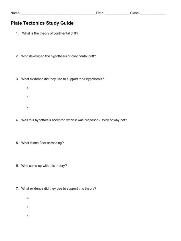 Name: ___ Date: ___ Class: ___ Plate Tectonics Study Guide 1. What is the theory of continental drift? 2. Who developed the hypothesis of continental drift? 3. What evidence did they use to support