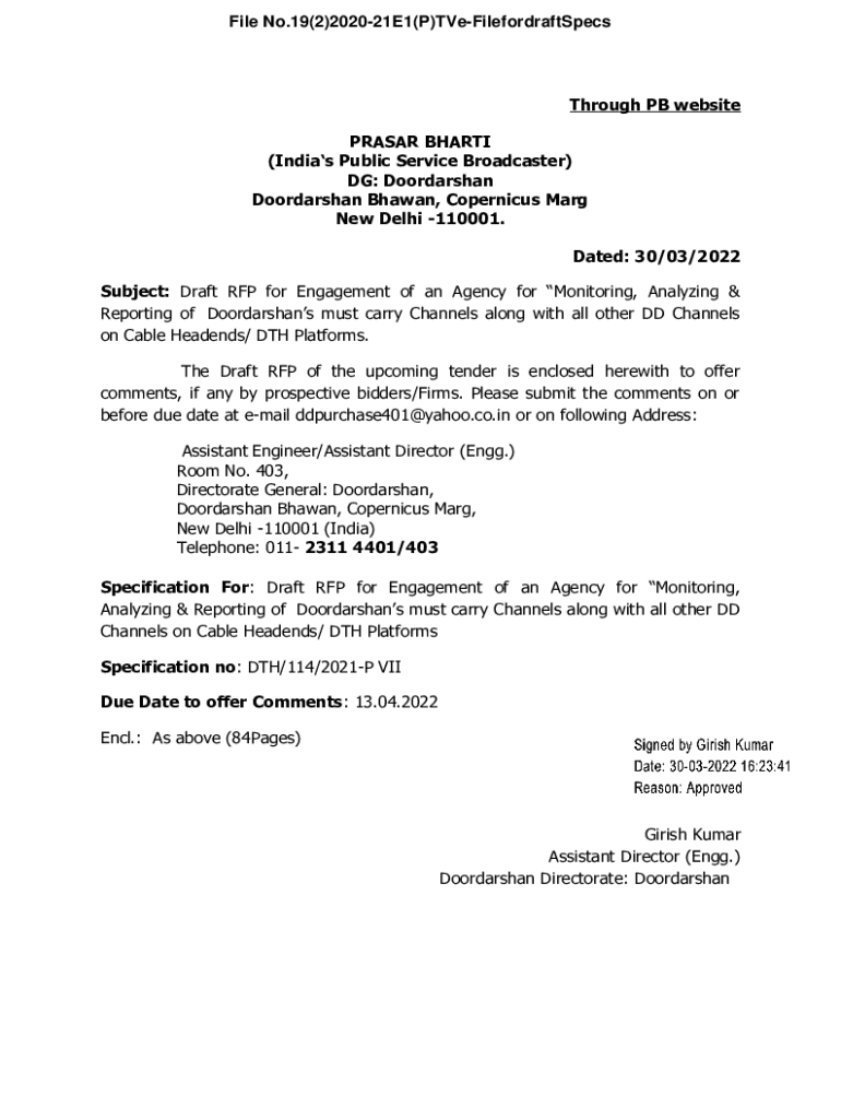 File No.19(2)202021E1(P)TVeFilefordraftSpecsThrough PB websitePRASAR CHART (India's Public Service Broadcaster) DG: DoorDash Shawn, Copernicus Mary New Delhi 110001. Dated: 30/03/2022 Subject: Draft