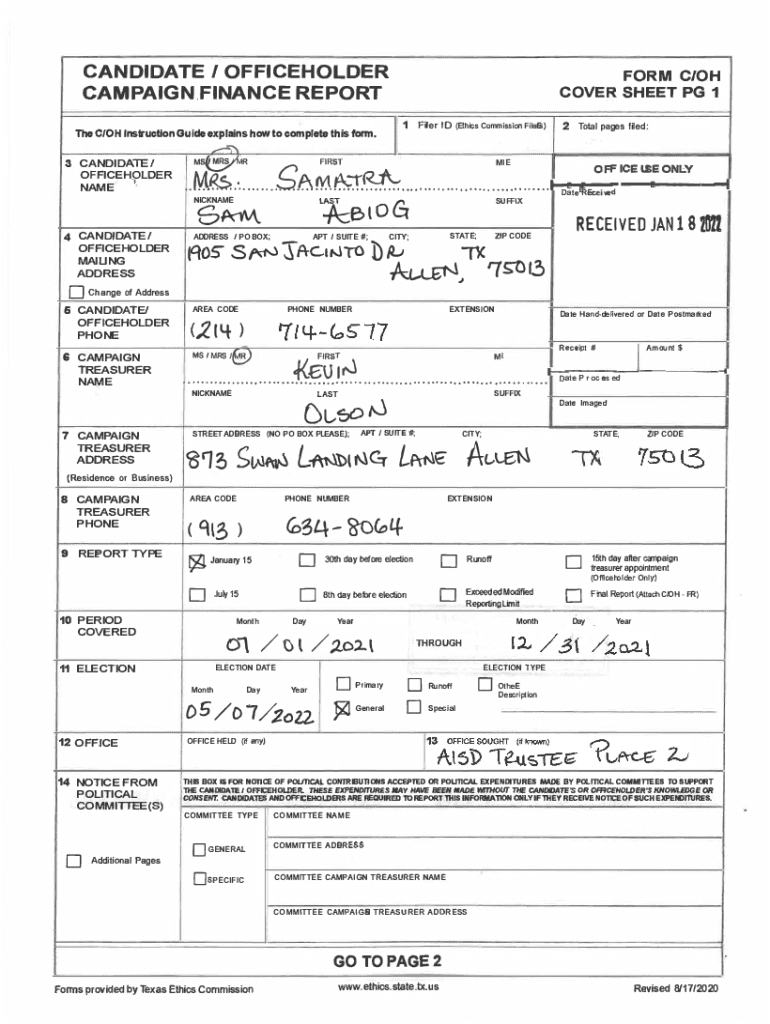 CANDIDATE / OFFICEHOLDER CAMPAIGN.FINANCE REPORT__,1The C/OH Instruction Guide explains how to complete this form. 3CANDIDATE/OFFICEH9LDERNAME4 CANDIDATE/OFFICEHOLDERMAILINGDLket o GtNICKNAMESkM.APT/