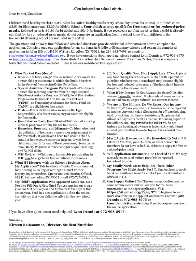 Allen Independent School District Dear Parent/Guardian: Children need healthy meals to learn. Allen ISD offers healthy meals every school day. Breakfast costs $1.55; lunch costs $2.80 for Elementary