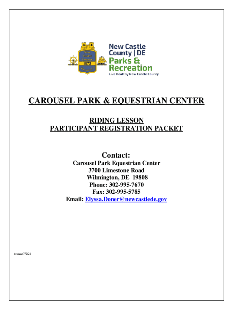 CAROUSEL PARK & EQUESTRIAN CENTER RIDING LESSON PARTICIPANT REGISTRATION PACKETContact: Carousel Park Equestrian Center 3700 Limestone Road Wilmington, DE 19808 Phone: 3029957670 Fax: 3029955785 Email: