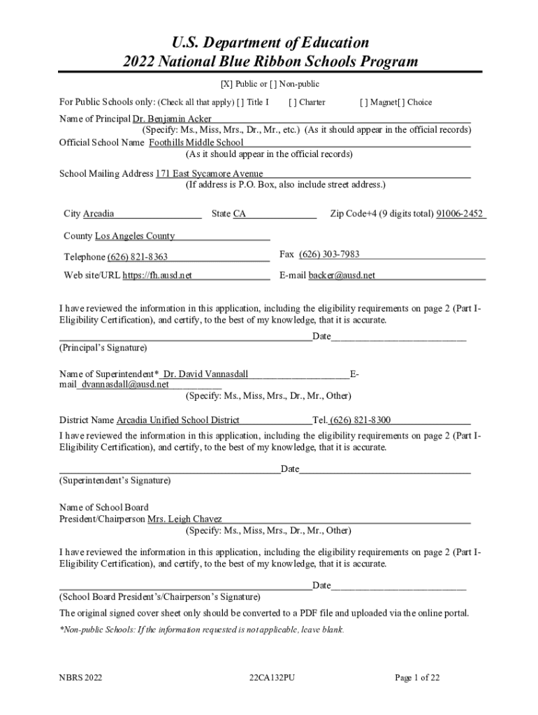 U.S. Department of Education 2022 National Blue Ribbon Schools Program [X] Public or [ ] Nonpublic Public Schools only: (Check all that apply) [ ] Title I[ ] Charter[ ] Magnet[ ] ChoiceName of Principal