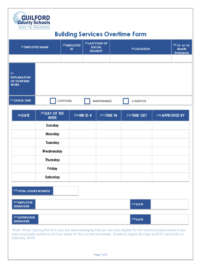 The purpose of the form is to track and document overtime work hours for payroll and regulation purposes.