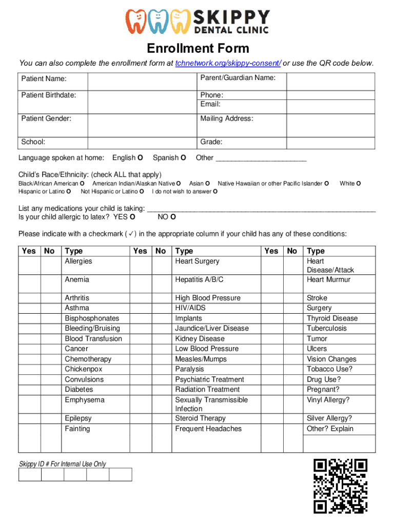 Enrollment Form can also complete the enrollment form at tchnetwork.org/skippyconsent/ or use the QR code below. Patient Name:Parent/Guardian Name:Patient Birthdate:Phone: Email:Patient Gender:Mailing
