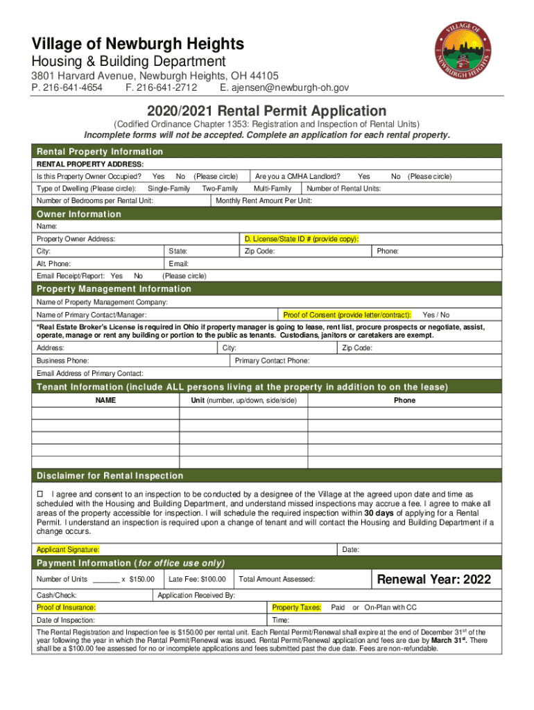 Village of Newburgh Heights Housing & Building Department 3801 Harvard Avenue, Newburgh Heights, OH 44105 P. 2166414654F. 2166412712E. Ajensen@newburghoh.gov2020/2021 Rental Permit Application (Codified