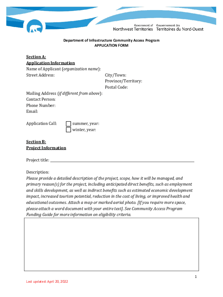 Department of Infrastructure Community Access Program APPLICATION Formation A: Application Information Name of Applicant (organization name): Street Address: City/Town: Province/Territory: Postal