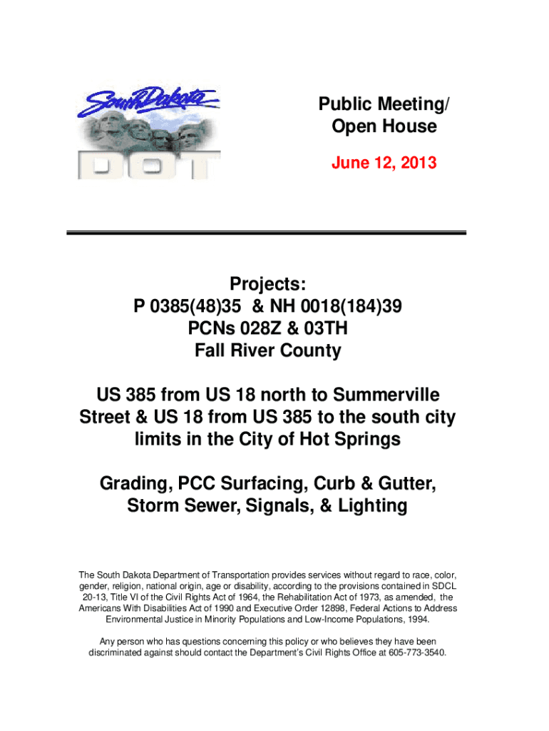 Public Meeting/ Open House June 12, 2013Projects: P 0385(48)35 & NH 0018(184)39 PCs 028Z & 03TH Fall River County US 385 from US 18 north to Summerville Street & US 18 from US 385 to the south city