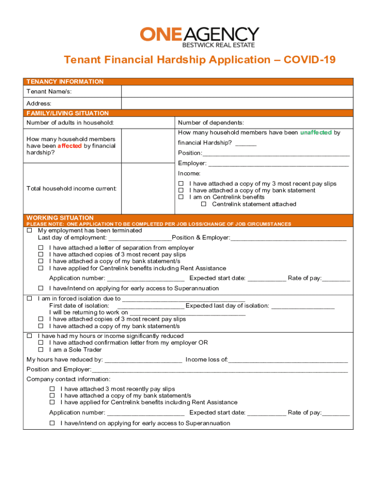 Tenant Financial Hardship Application COVID-19 TENANCY INFORMATION Tenant Name/s: Address: FAMILY/LIVING SITUATION Number of adults in household:Number of dependents: How many household members have