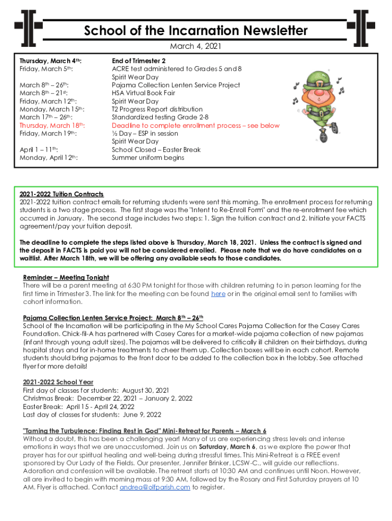 School of the Incarnation Newsletter March 4, 2021, Thursday, March 4th: Friday, March 5th: March 8th 26th: March 8th 21st: Friday, March 12th: Monday, March 15th: March 17th 26th: Thursday, March