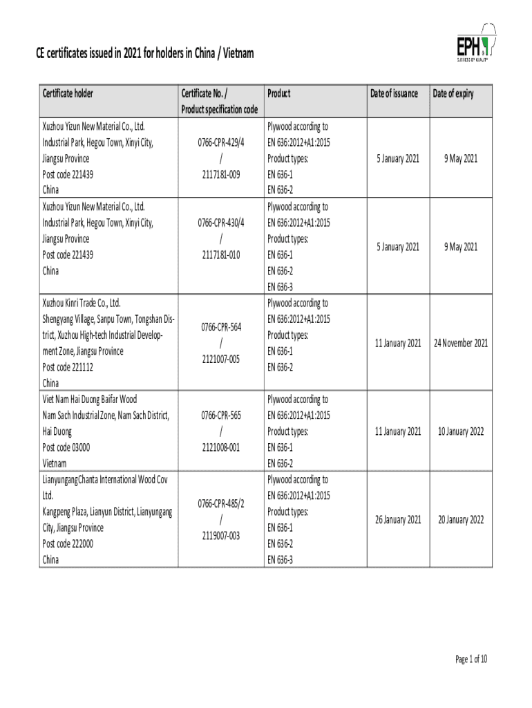 CE certificates issued in 2021 for holders in China / Vietnam Certificate holder Xuzhou Yin New Material Co., Ltd. Industrial Park, Hero Town, Mini City, Jiangsu Province Post code 221439 China Xuzhou