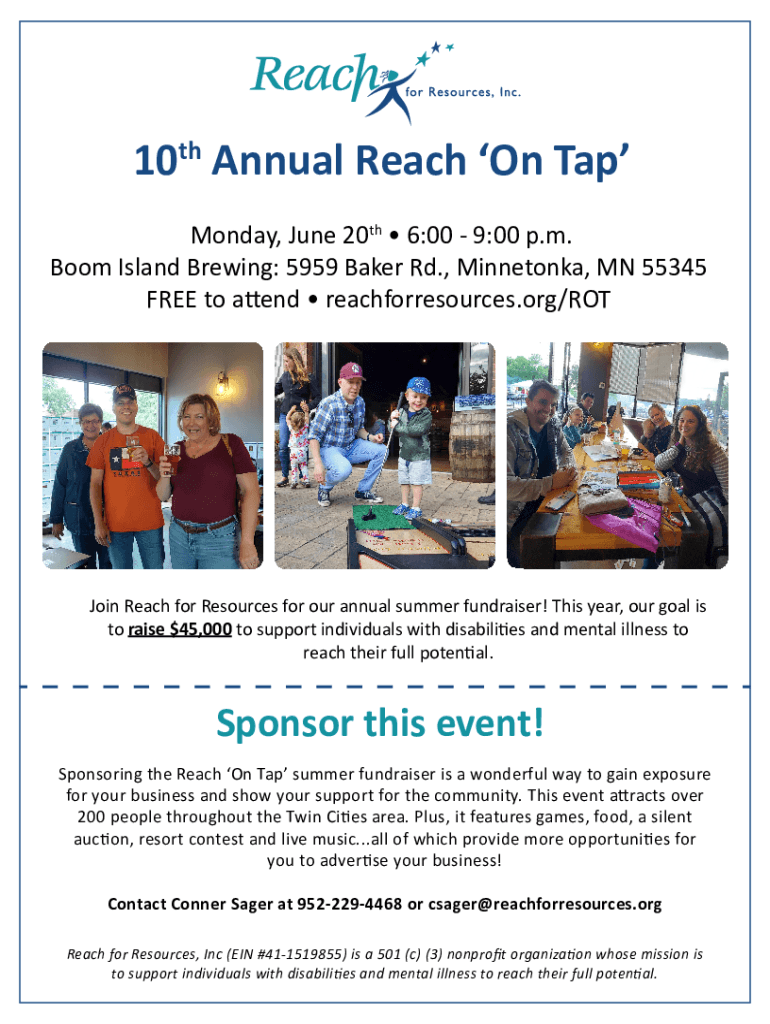 10th Annual Reach On Tap Monday, June 20th 6:00 9:00 p.m. Boom Island Brewing: 5959 Baker Rd., Minnetonka, MN 55345 FREE to attend reachforresources.org/ROTJoin Reach for Resources for our annual