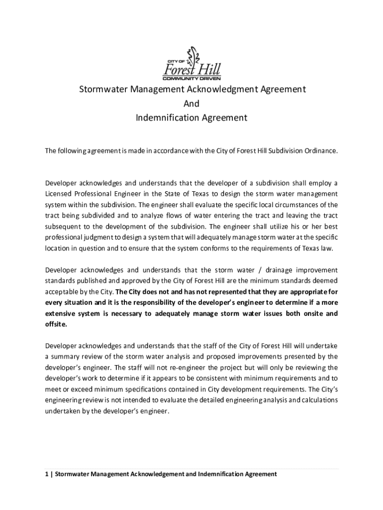 Stormwater Management Acknowledgment Agreement And Indemnification Agreement The following agreement is made in accordance with the City of Forest Hill Subdivision Ordinance. Developer acknowledges