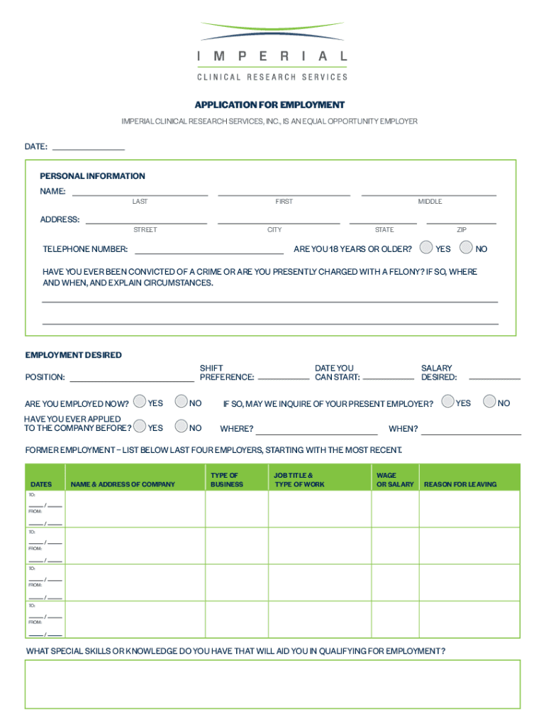 APPLICATION FOR EMPLOYMENT IMPERIAL CLINICAL RESEARCH SERVICES, INC., IS AN EQUAL OPPORTUNITY EMPLOYERDATE: PERSONAL INFORMATION NAME:MISADDRESS:FIRSTSTREETMIDDLECITYSTATEZIPYESARE YOU 18 YEARS OR